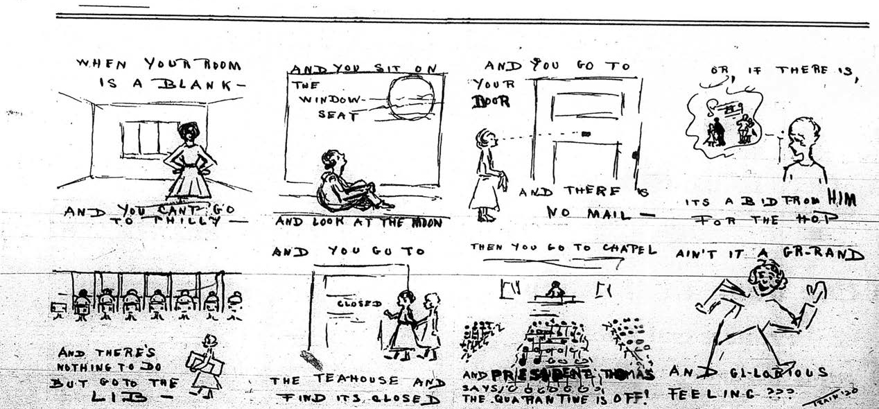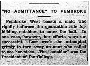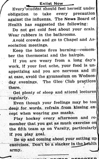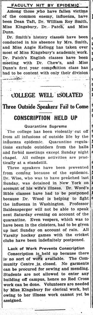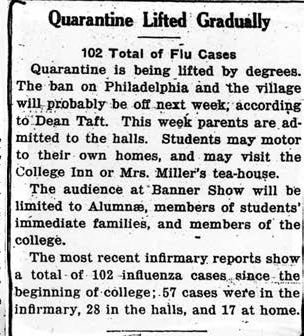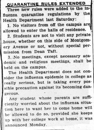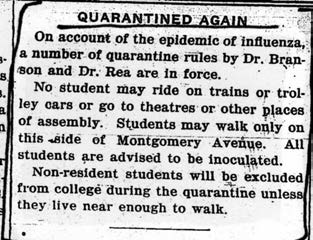 As the Michigan Study notes, “Students were advised to avoid crowds (yet they were also expected to go to chapel and association meetings) and to get plenty of both exercise and rest. Students were forbidden to enter theaters and other places of public assembly, were prohibited from crossing Montgomery Avenue (the main street separating campus from town) and were informed they could not ride public transportation. Furthermore, non-resident students were excluded from the college unless they lived near enough to campus to walk. Off-campus visitors, including mothers, were henceforth prohibited from entering residence halls; mothers were allowed to see their daughters only if the daughters were ill and being cared for at the infirmary. Students were likewise forbidden to visit private homes (even those on the campus side of Montgomery Avenue) without the express permission of the dean.”